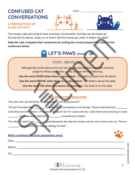 Two cats are having a conversation, but are a little confused. The student have to complete the sentences using the correct preposition word (above, over, on, below, under).