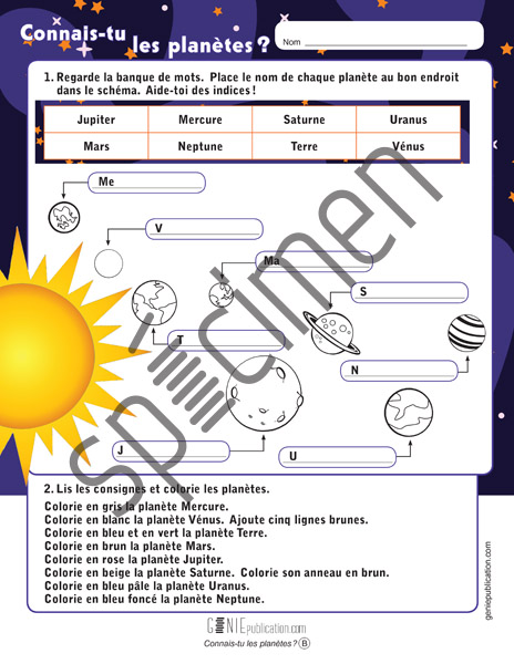 L’élève doit compléter l’image en inscrivant le nom de chacune des planètes et en coloriant celles-ci de la bonne couleur.