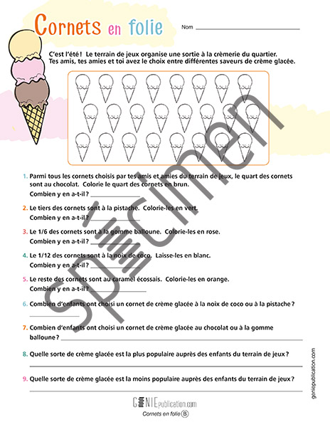 L’élève doit déterminer la saveur de chaque cornet de crème glacée à l’aide des fractions qui lui sont données.