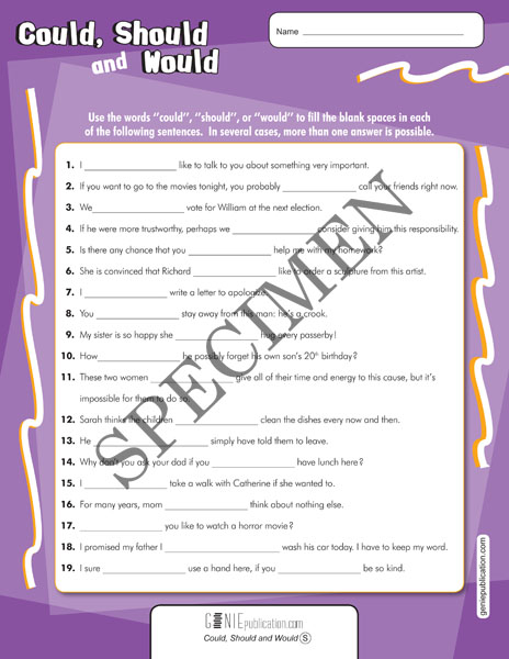 L'élève doit compléter les vingt phrases proposées dans cet exercice en employant correctement les mots « could », « should » et « would ».