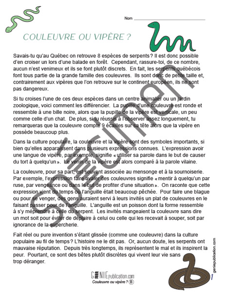 L’élève lit un texte qui compare la couleuvre québécoise à la vipère européenne, puis répond à des questions pour vérifier sa compréhension.