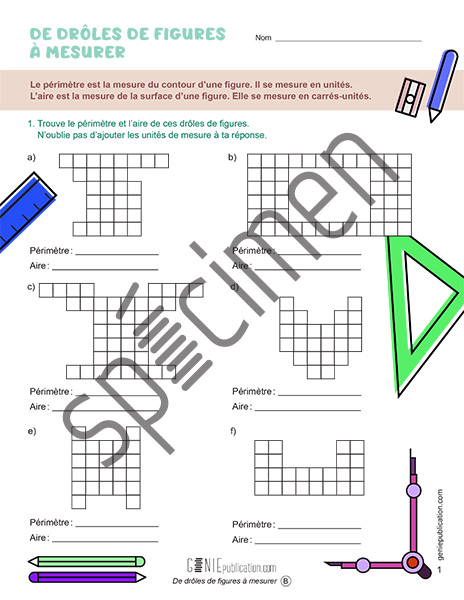 L’élève doit déterminer le périmètre et l’aire de figures.