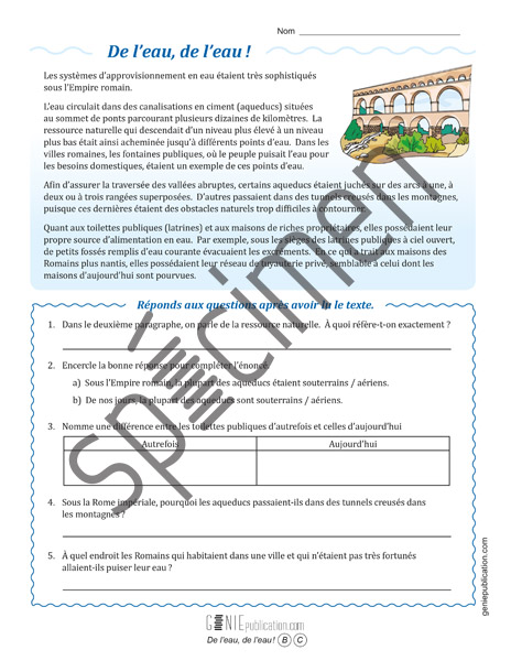 L'élève doit lire un texte sur l'approvisionnement en eau sous l'Empire romain, puis répondre à des questions.