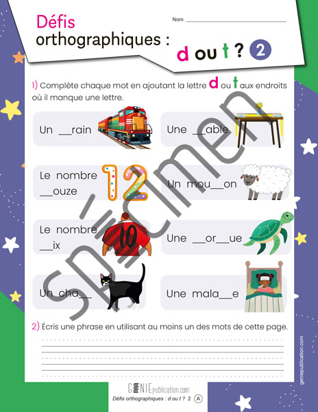 L’élève doit compléter les mots avec la lettre manquante, « d » ou « t ». Puis, il écrit une phrase en utilisant l’un de ces mots.