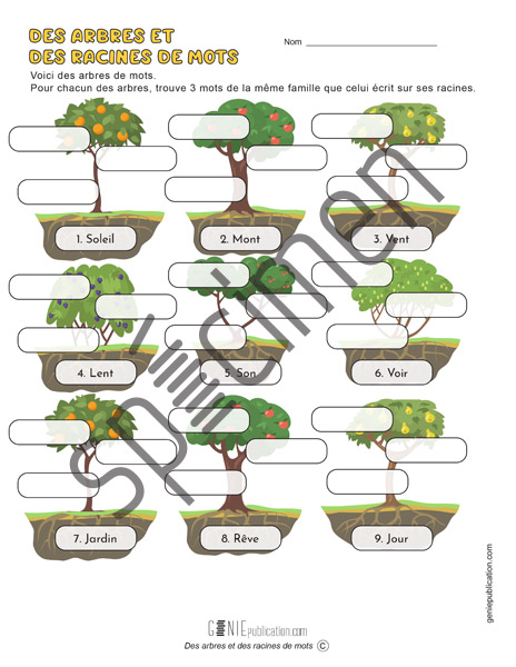 L’élève doit trouver trois mots de la même famille pour chaque mot qui lui est présenté.