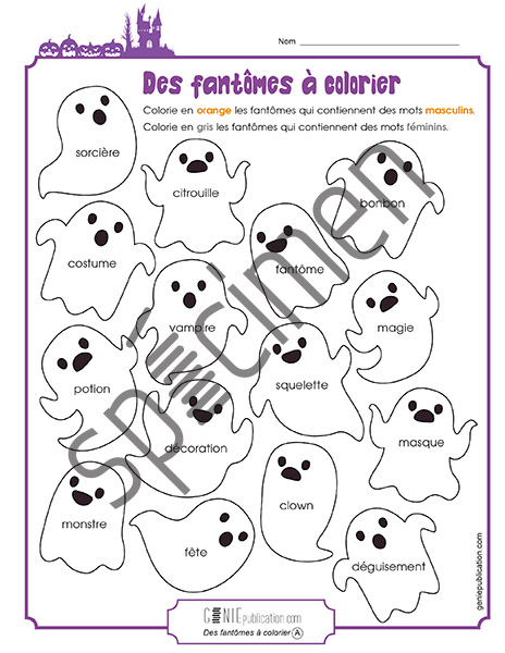L’élève doit déterminer si un mot est masculin ou féminin, puis colorier le fantôme de la bonne couleur.
