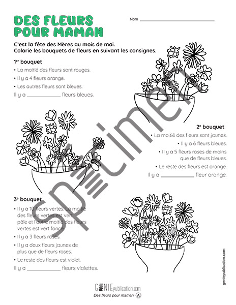 L’élève doit colorier les fleurs des bouquets de la bonne couleur en suivant les indications.