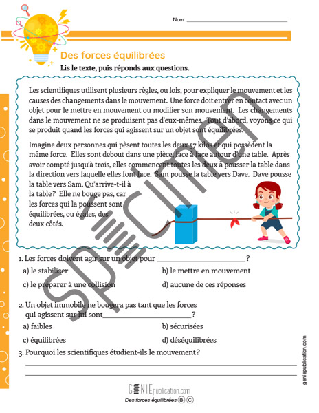L’élève lit un texte sur la force exercée sur un objet, puis répond à des questions.
