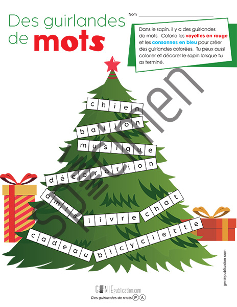 L'élève doit colorier les voyelles et les consonnes dans les guirlandes du sapin.
