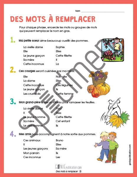 L'élève doit encercler les mots ou les groupes de mots qui peuvent remplacer les mots en gras dans les phrases.