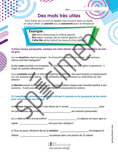 L’élève doit identifier les pronoms et les synonymes dans de courts paragraphes. Il doit ensuite proposer différents pronoms et synonymes pour remplacer un mot dans une phrase.