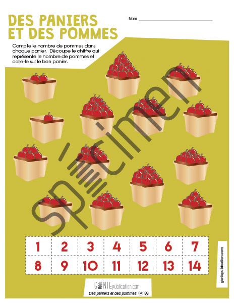 L'élève doit compter le nombre de pommes de chaque panier puis coller le chiffre correspondant sur les paniers.