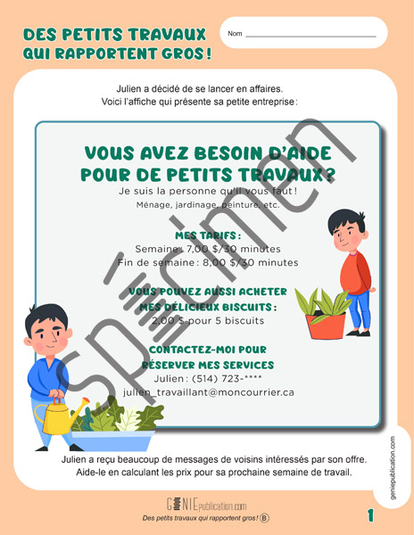 L’élève doit calculer les profits de Julien pour les petits travaux qu’il effectue dans son voisinage.