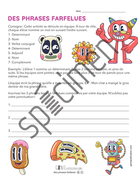 Activité créative où les élèves doivent créer des phrases loufoques en disant des mots de différentes classes à tour de rôle.
