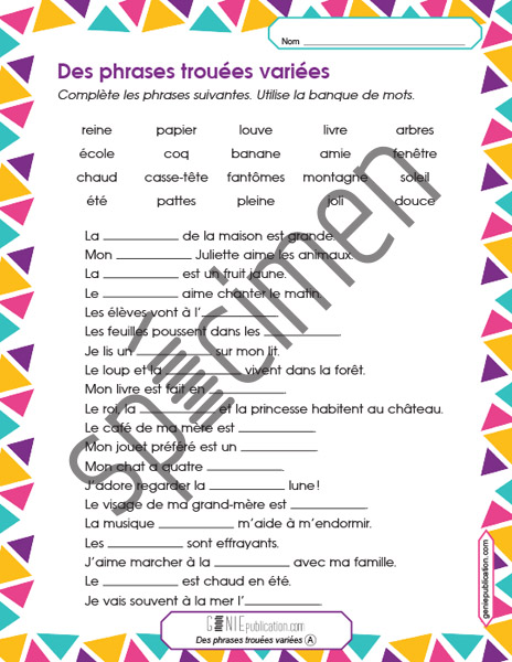 L’élève doit compléter les phrases en utilisant une banque de mots.