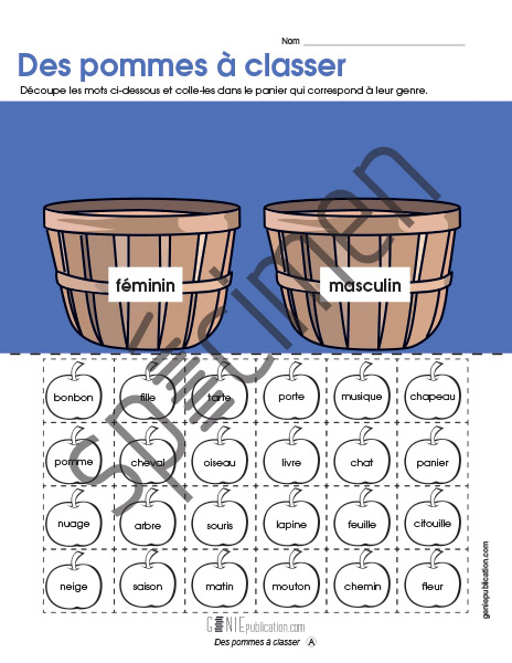 L'élève doit classer les pommes selon le genre de mots qui y sont inscrits.