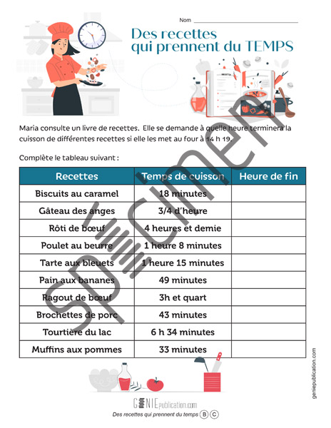 L’élève calcule le temps de cuisson pour différentes recettes.