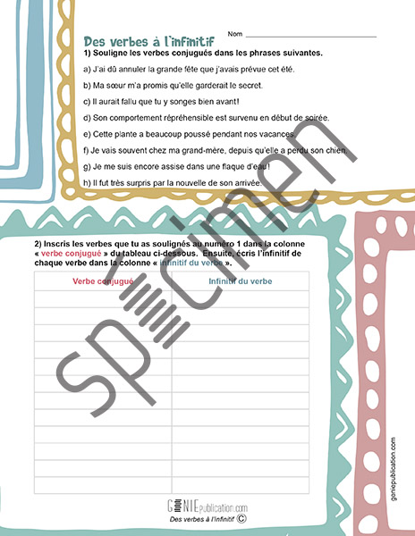 L’élève doit identifier les verbes conjugués dans les phrases. Il doit les classer et déterminer leur forme à l’infinitif.