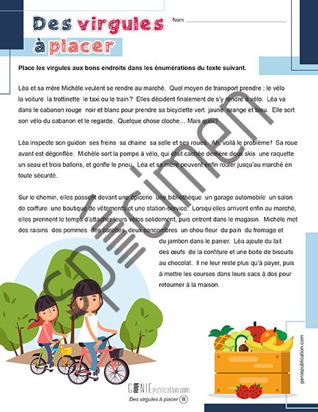 L’élève doit lire un texte et ajouter les virgules aux bons endroits dans les énumérations.