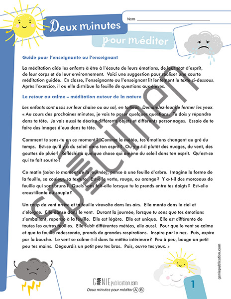 L’enseignante ou l’enseignant guide une courte séance de méditation en classe. Les élèves doivent ensuite revenir sur leur expérience en répondant à des questions.
