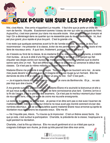 L’année scolaire s’achève. Alexis vient de déménager. Il doit terminer l’année dans une nouvelle école. De grands défis se présenteront à lui, comme se faire des amis en un temps record. Un exposé oral amènera Alexis à parler de sa famille quelque peu différente, mais franchement amusante. Au-delà de la compréhension de lecture, ce texte est également une belle façon d’aborder l’homosexualité. À la suite de sa lecture, l’élève devra répondre à des questions sur sa compréhension.