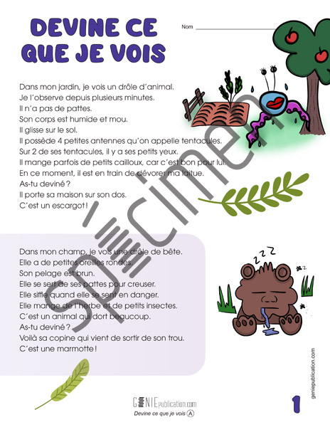 Cette activité de lecture permet à l’élève de développer ses réflexes d’inférence. L’élève doit lire 5 petites descriptions qui lui dévoilent peu à peu un animal. Les images humoristiques présentent des animaux inventés qui possèdent certaines caractéristiques des descriptions. La réponse est dévoilée à la fin de chaque paragraphe.