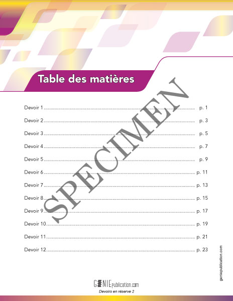 Le but premier des documents Devoirs en réserve est d'offrir aux enseignants et aux enseignantes une provision de devoirs pour l'année. Chacun des deux volumes compte une douzaine de devoirs de deux pages contenant six ou sept activités.