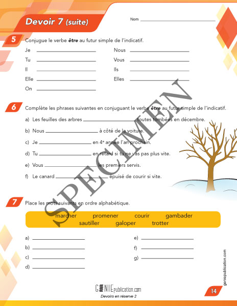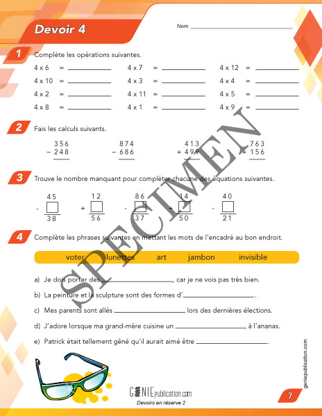 Dans chaque devoir, l'élève devra effectuer des exercices de calcul mental et de calcul écrit. Il devra ensuite compléter une activité de vocabulaire et une ou des activités de conjugaison. Ici et là, l'élève aura aussi à compléter des exercices sur d'autres compétences en français et en mathématique comme la différenciation de certains homophones et la résolution de problèmes.