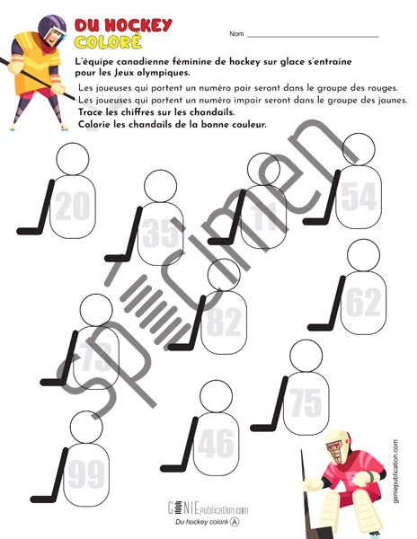 L’élève doit tracer les nombres sur les chandails de hockey et colorier les nombres pairs et impairs de la couleur indiquée.