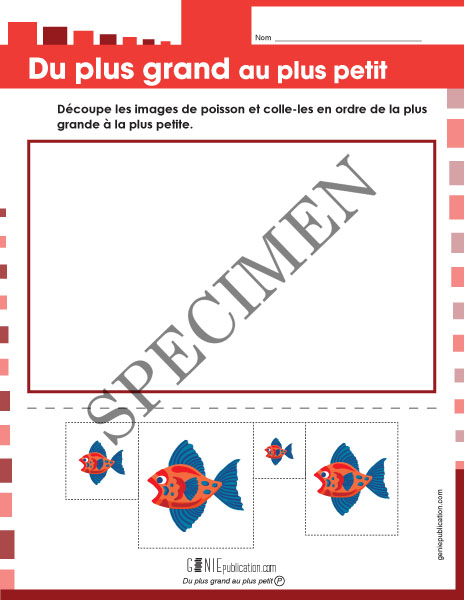 L'élève doit découper et placer des images dans l'ordre de la plus grande à la plus petite.