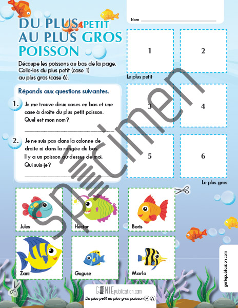 L'élève doit découper et placer des poissons en ordre croissant selon leur grosseur.