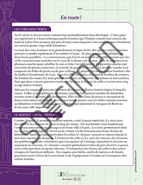L'élève doit lire un texte sur les voies routières sous l'Empire romain, puis répondre à des questions de compréhension.