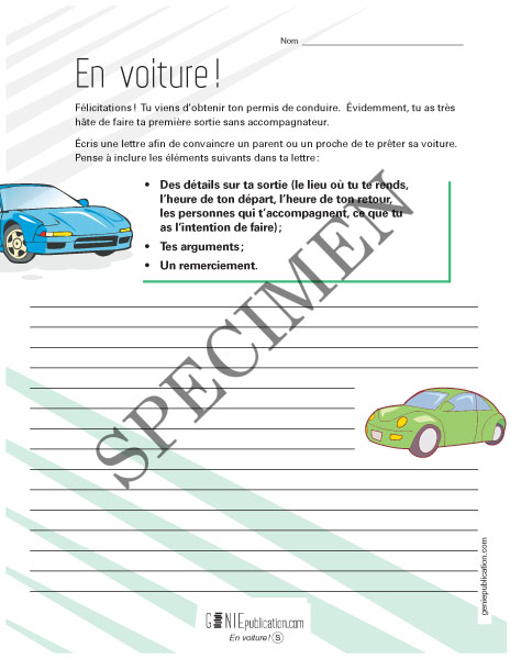 L'élève doit écrire un court texte argumentatif dans le but fictif de convaincre un parent ou un proche de lui prêter sa voiture pour une sortie.