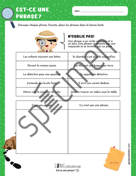 L’élève doit découper des groupes de mots et les classer pour indiquer s’il s’agit d’une phrase.