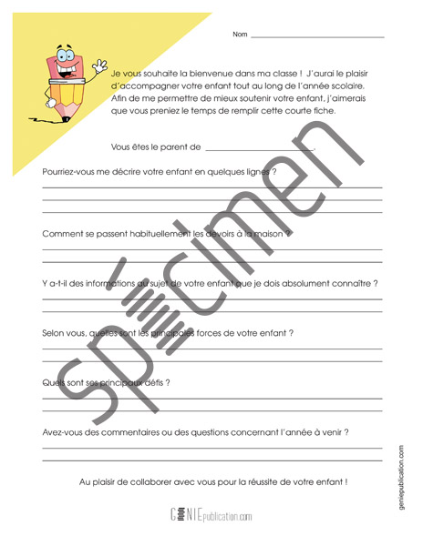 Cette fiche peut être distribuée aux parents par l'enseignant(e) en début d'année afin d'Avoir un portrait de leur enfant.