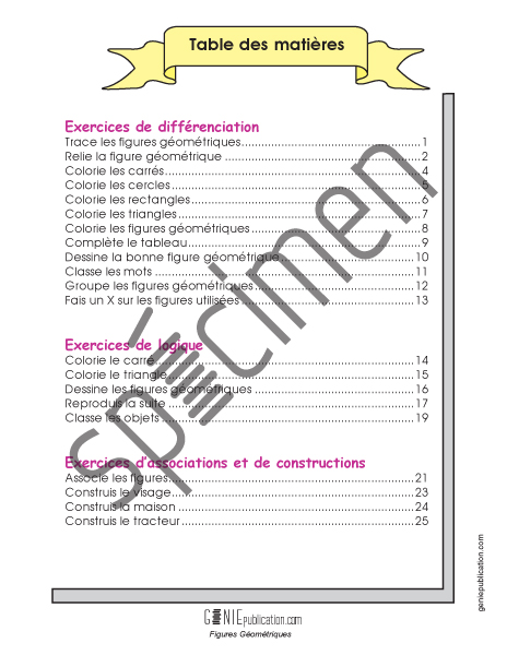 La deuxième partie présente sept pages d’exercices de logique. Ces exercices, ayant les figures géométriques comme thème commun, abordent les suites logiques, la notion à l’intérieur et à l’extérieur et le classement d’objets.