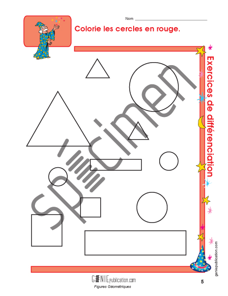 La première partie comprend treize pages d’exercices de différenciation. L’élève, à partir d’activités variées, prend conscience des caractéristiques qui permettent de distinguer les quatre figures géométriques de base. Pour ce faire, il est appelé à colorier, à dessiner, à relier et à classer.