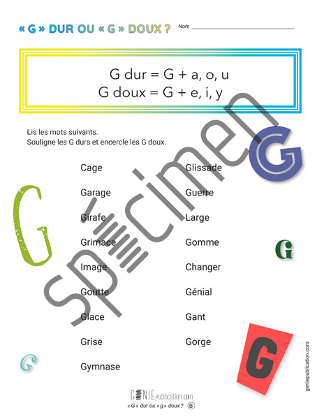 Dans une liste de vocabulaire, l’élève doit souligner les « g » durs et encercler les « g » doux.