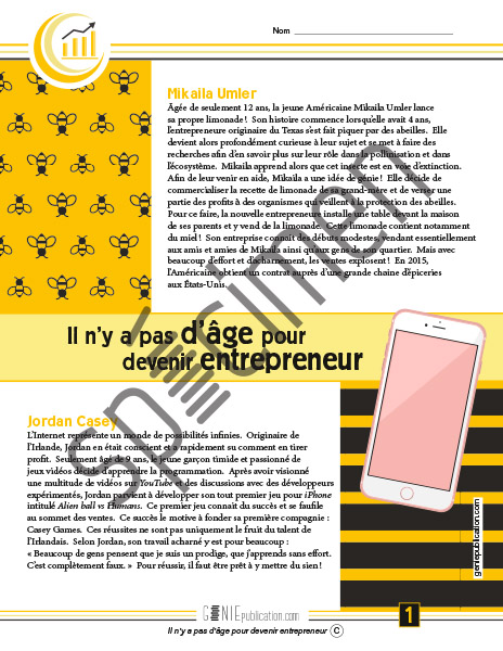Compréhension de texte qui présente Mikaila Ulmer et Jordan Casey, deux jeunes entrepreneurs.