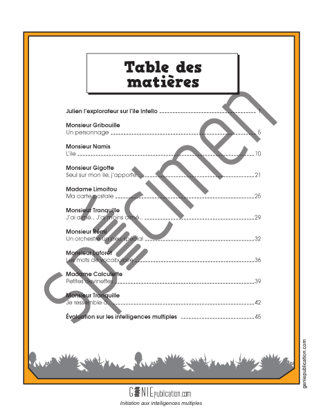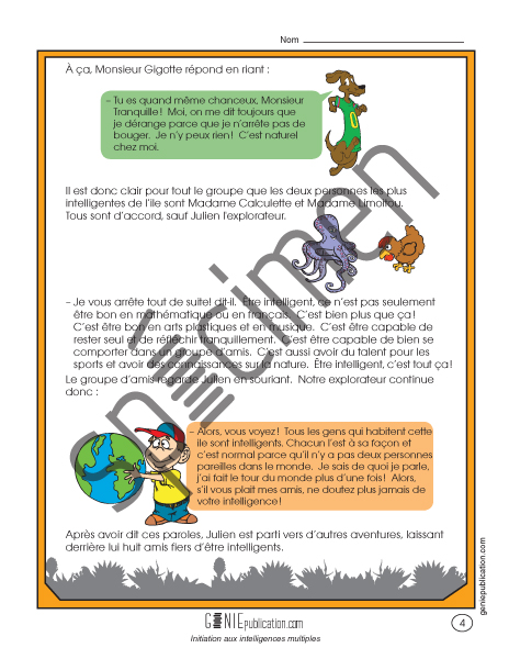 avec ses amis de l’ile Intello ! L’histoire de la visite de Julien l’explorateur sur son ile préférée enchantera vos élèves et les familiarisera avec les différents personnages ainsi qu’avec leurs qualités et leurs aptitudes prédominantes. Ensuite, les activités proposées, toujours en lien avec l’histoire de Julien, les amèneront à travailler à la manière de chacun des personnages, tout en les initiant aux intelligences multiples.