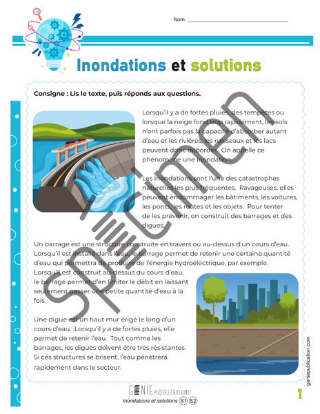 L’élève doit lire un texte portant sur les inondations et sur les solutions pour tenter de les prévenir, soit les barrages et les digues. Ensuite, il doit répondre à 5 questions.