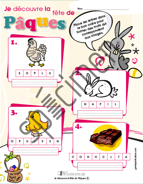 L'élève doit placer des lettres en ordre pour former des mots sur le thème de Pâques.