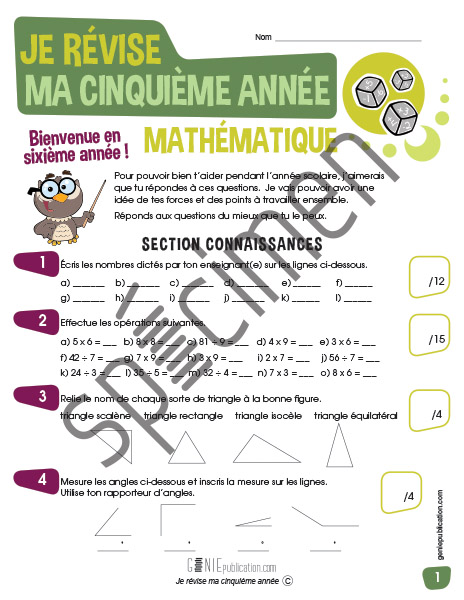 Ce document propose une révision des notions de la cinquième année et s'adresse aux élèves qui commencent leur sixième année du primaire. Il peut être utilisé par l'enseignant comme test diagnostique en début d'année afin d'avoir une idée du niveau des élèves et de leur compréhension. Il peut aussi être utilisé par l'enseignant en fin d'année pour effectuer une révision des notions vues pendant l'année scolaire.