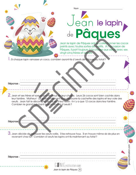 L’élève doit résoudre de petits problèmes pour déterminer combien d’œufs Jean le lapin de Pâques a trouvés.