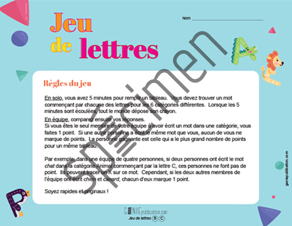Dans ce jeu, l’élève doit trouver des mots qui commencent par les lettres données dans chacune des catégories.