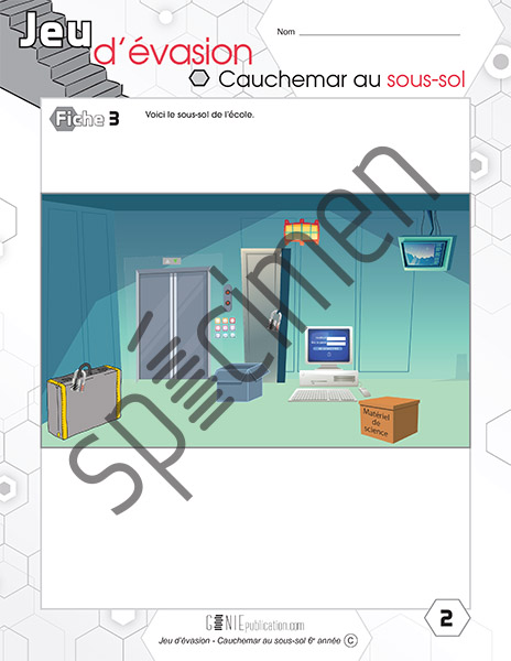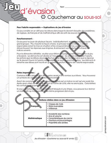 L'élève doit résoudre différentes énigmes de logique, de français et de mathématique pour s'échapper du sous-sol de l'école. Ce jeu d'évasion comprend les directives à l'adulte ainsi que les fiches des énigmes.
