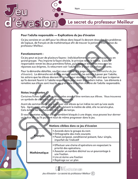 L'élève doit résoudre différentes énigmes de logique, de français et de mathématique pour trouver la potion magique du professeur Meilleur. Ce jeu d'évasion comprend les directives à l'adulte ainsi que les fiches des énigmes.