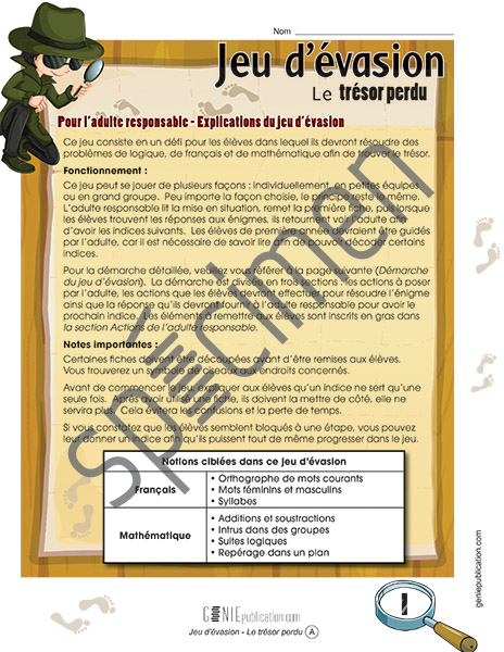 L'élève doit résoudre différentes énigmes de logique, de français et de mathématique pour trouver le trésor. Ce jeu d'évasion comprend les directives à l'adulte ainsi que les fiches des énigmes.