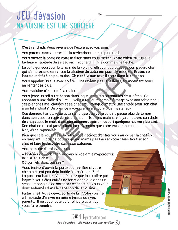 Ton chien s’est sauvé pour courir après le chat de ton étrange voisine et est entré par la chatière de son cabanon. La voisine n’est pas là. Il faut faire sortir ton chien avant qu’il démolisse tout ! Tu décides de te faufiler par la chatière, mais tu te rends compte que tu es enfermé à l’intérieur. Dans ce jeu d’évasion, l’élève doit résoudre différentes énigmes de logique, de français et de mathématique pour sortir du cabanon de la voisine. Ce jeu comprend les directives à l’adulte ainsi que les fiches des énigmes.