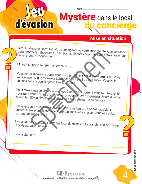 Dans cette activité, l'élève doit résoudre différentes énigmes de logique, de français et de mathématique pour s'échapper du local du concierge. Ce jeu d'évasion comprend les directives à l'adulte ainsi que les fiches des énigmes.
